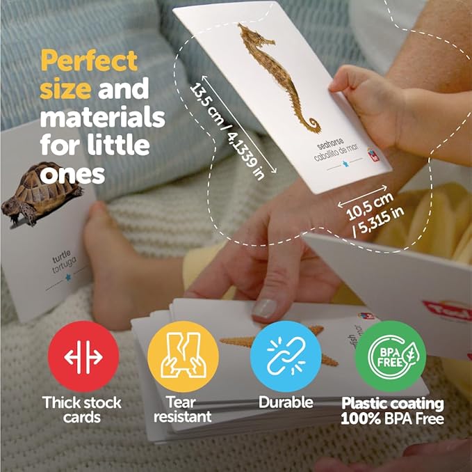 - REAL PHOTO CARDS : Our kinder cards serve as an engaging preschool learning activity and toddler learning toy, enhancing their vocabulary (spanish flashcards) and understanding of the animal kingdom.