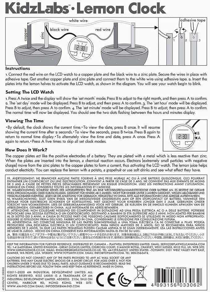 4M Kidzlabs Lemon Powered Clock, Chemical Electrical Science Lab Experiment - STEM Toys Educational Gift for Kids & Teens, Girls & Boys 12 Count (Pack of 1)