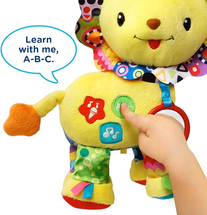 - Press the colorful shape buttons on the Crinkle and Roar Lion to explore shapes, colors and letters