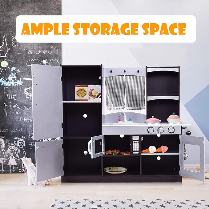 - 【Large Storage Space】Open the door under the sink and stove to storage as many food as possible. Besides, there is also the space aside the microwave to hold added food or cookware, which can exercise children’s classification and organization ability. With so much storage space, kids won't mess up the kitchen playset during the entertainment.