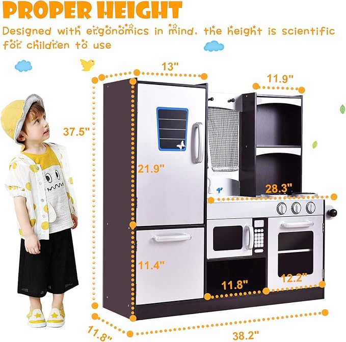 - 【Certified Playset & Wide Application】ASTM and CPSIA certification means this kitchen set is a safe yet exciting for any child to join in on the fun. Measuring 38.2"L x 11.8"W x 37.4"H, the freestanding pretend play kitchen is perfect for playroom, bedroom, daycare, school classroom.