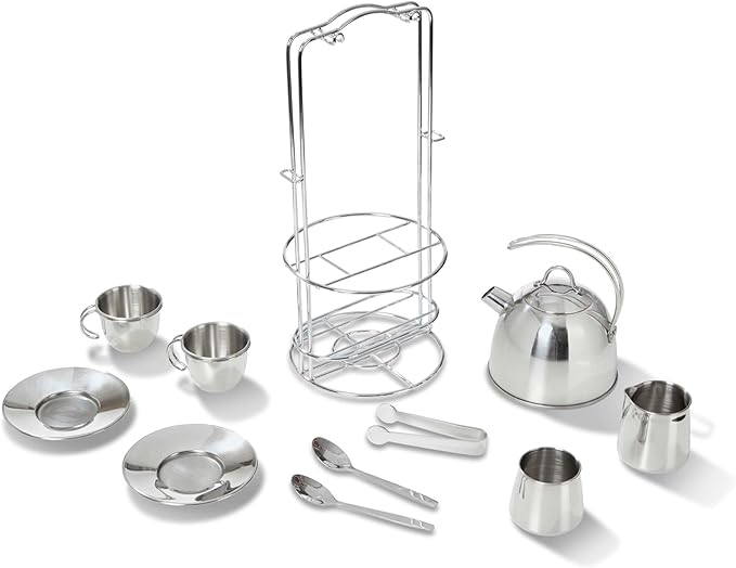 Melissa & Doug Stainless Steel Pretend Play Tea Set and Storage Rack for Kids (11 pcs)