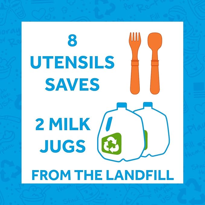 - Sustainable and Reliable: Re-Play's toddler fork and spoon set is made in the USA from recycled milk jugs, making a positive contribution to a more sustainable environment