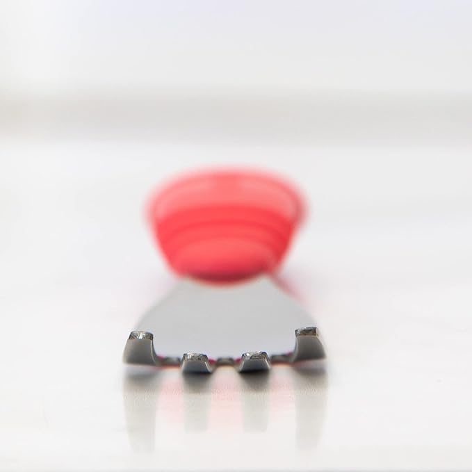 - TODDLER UTENSILS – This set is sized and shaped just right for self-feeding; concave stainless-steel fork and spoon heads help keep food on the utensils; outer fork tines are bent (like a spork) to help pierce solid foods and keep food on the fork