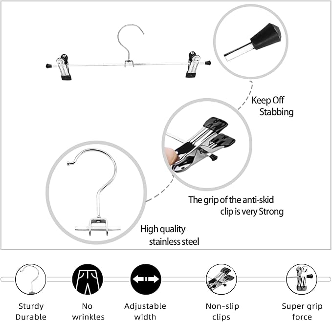 - [Metal skirt hangers] - Our Skirt Hanger is made of high quality metal material. Clip hangers robust and easy to use, prevents rust and resists breakage.