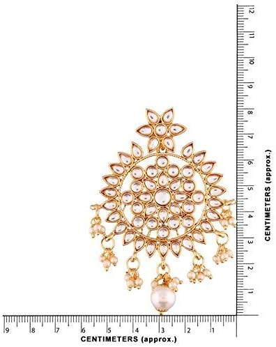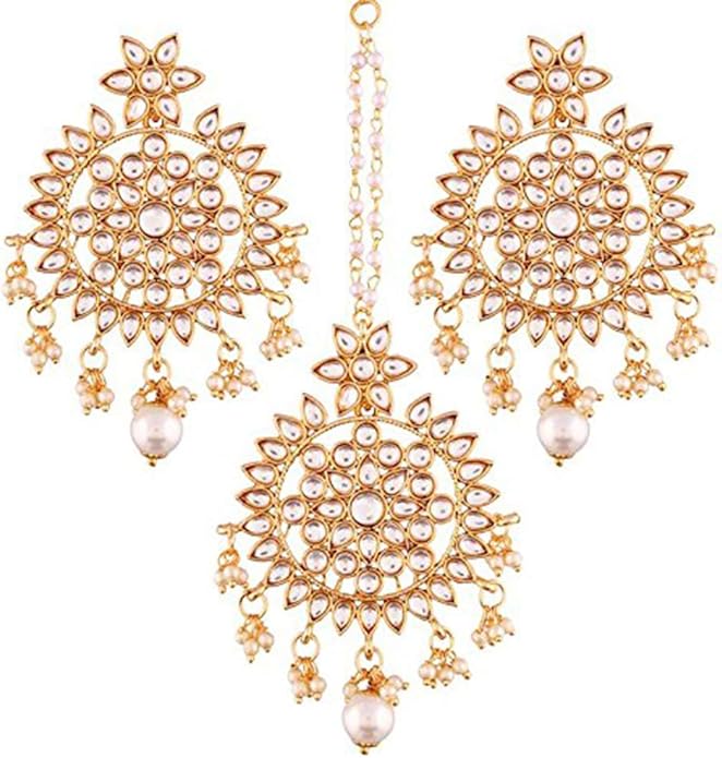 Aheli Ethnic Faux Kundan Drop Pearl Beads Dangle Earrings Maang Tikka Set Bollyood Fashion Jewelry for Women & Girls