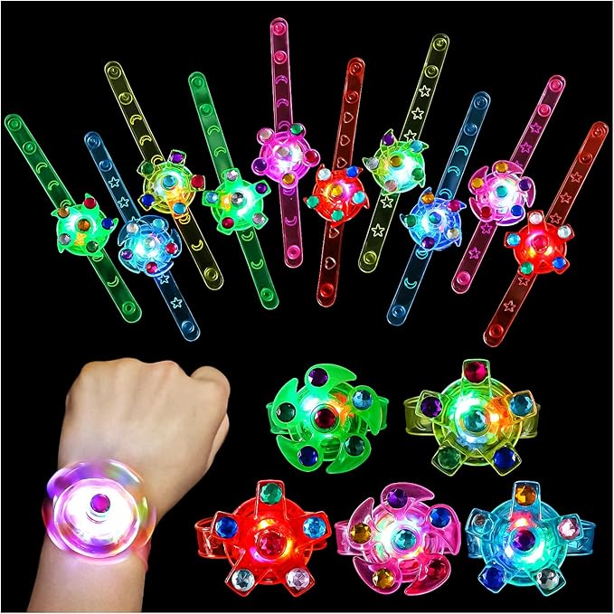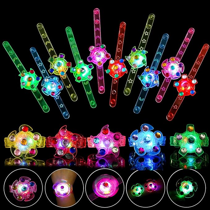 - 🎁These goodie bag stuffers characterized by its rotation. Our light up bracelets break the conventional features of play bracelets that can only emit light and flicker. Its rotation catches attention. For children, their attention can be focused on the spinner. And for adults, the distraction of attention to the glow in the dark party supplies can help them break away from troubles, relieve anxiety, and release pressure to some extent. This is what you want, more fun and less pressure.