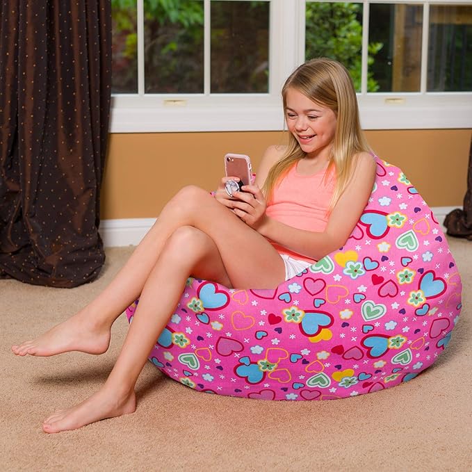 Posh Creations Bean Bag Chair for Kids, Teens, and Adults Includes Removable and Machine Washable Cover, Canvas Multi-Colored Hearts on Pink, 38in - Large