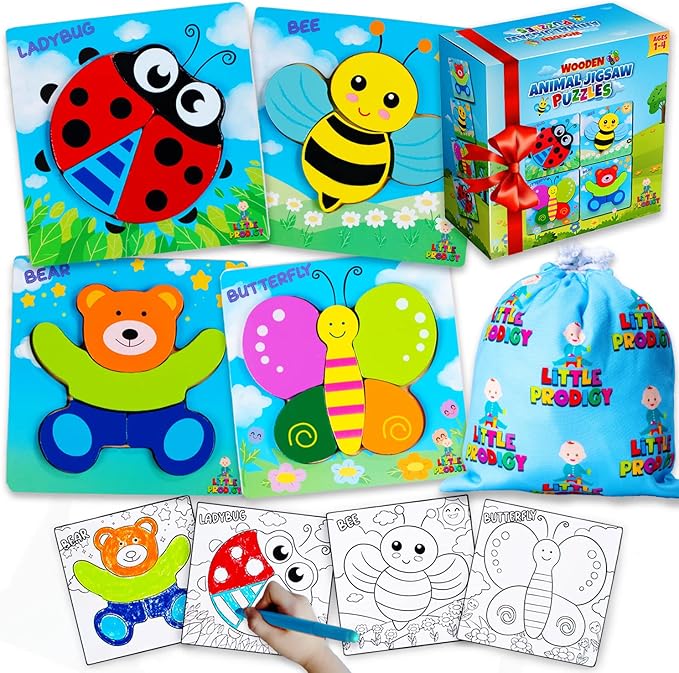 Wooden Puzzles for Toddlers 1-3 Girls & Boys, Sensory Toys, Educational Learning Toys: 4 Puzzles Ages 1-3, Gift Box, Storage Bag, Matching Coloring Book, Animals Puzzle for Toddlers Set of 4