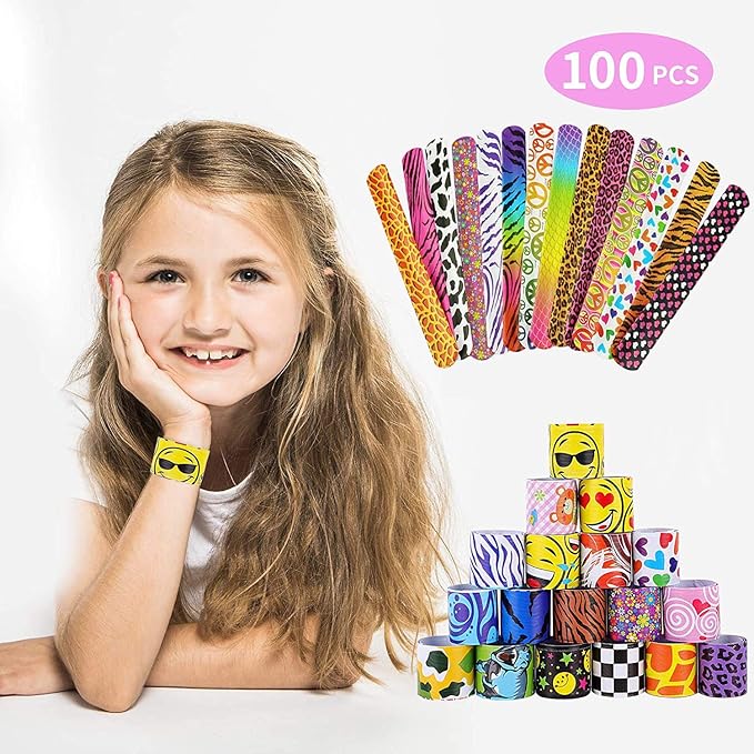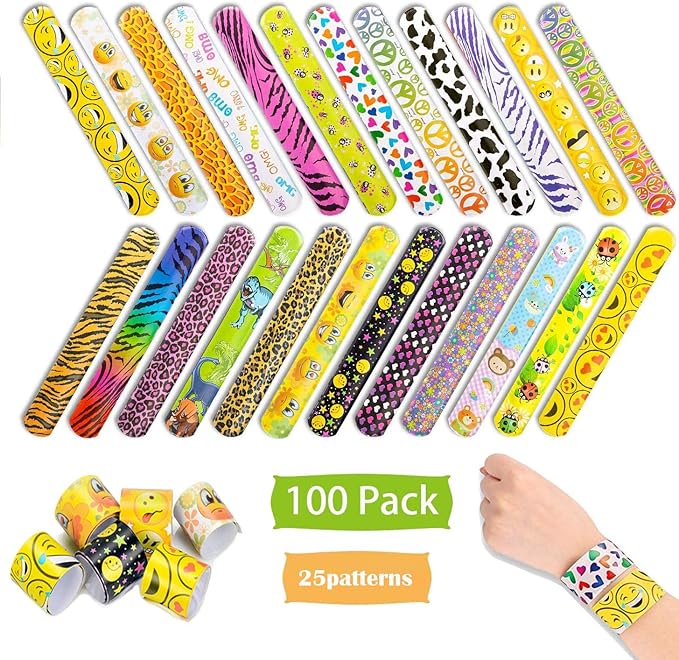 100 Pack Slap Bracelets | Slap Bands Birthday Party Supplies Favors with Hearts & Animal Print | One Size Fits All | For Kids, Boys, And Girls