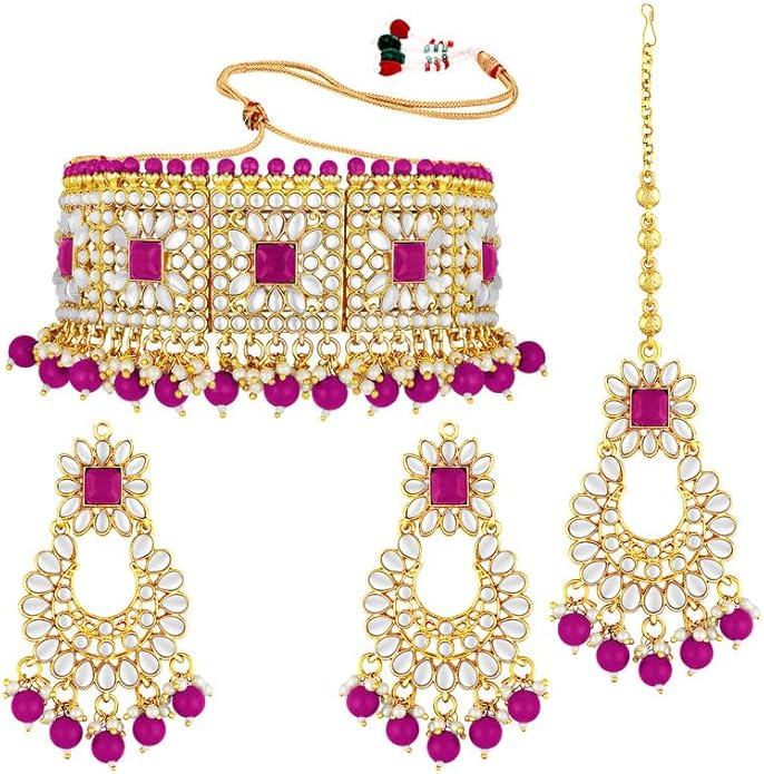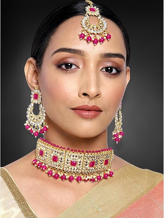 Aheli Bridal Kundan Faux Pearl Choker Necklace with Earrings Maang Tikka Gift for Women Indian Traditional Bollywood Fashion Jewelry Set