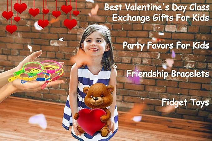 - A must-have along with all the stretchy skeletons, sticky hands, balloons, animal twist bracelets, candy, stretchy lizards, squishy toys, glow light rings, inflatable toys, slime, cupcakes, and novelty toys in candy bags. Be the talk of the school and neighborhood with these Valentine's Friendship Fidget Zipper Bracelets. These toys can be the giveaway of the day of your party!