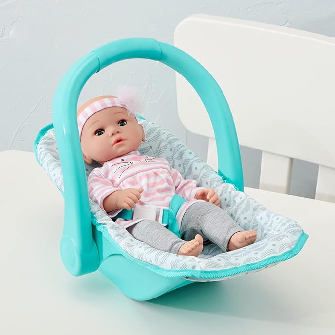 - Imaginative Play: Doll accessories help children develop motor skills and learn to care for others; Versatile car seat and carrier has removable, washable gray patterned fabric cover; Doll not included