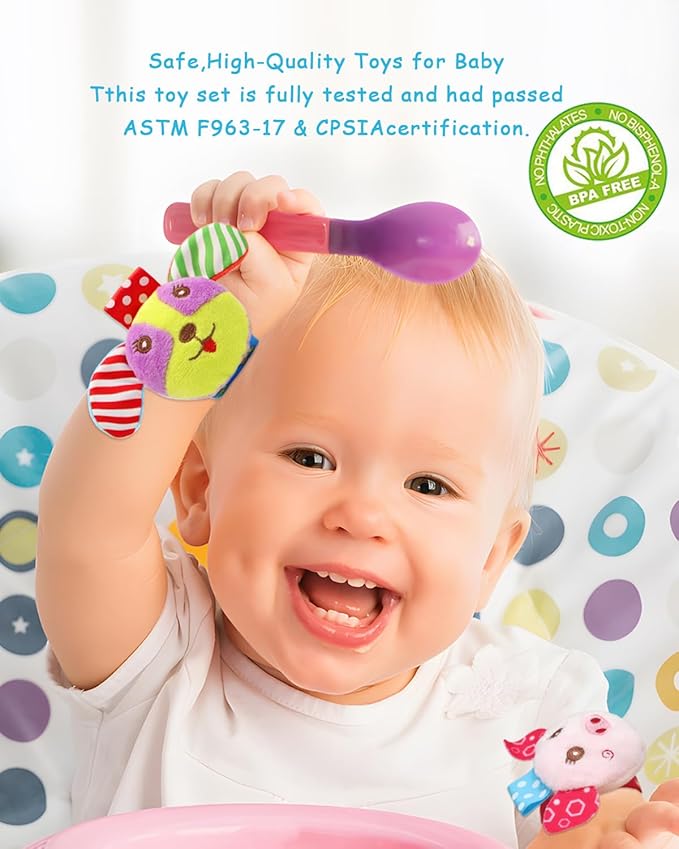 - BABY PARTNER -- Baby Rattles set was suitable for 0 month up babies boys or girls.The toys always keeps in hand, baby will not lose them or throw them on the ground. Best toys for babies when they're in stroller/infant Car Seat/mamaroo/bed/baby chair/Baby Carrier alone.