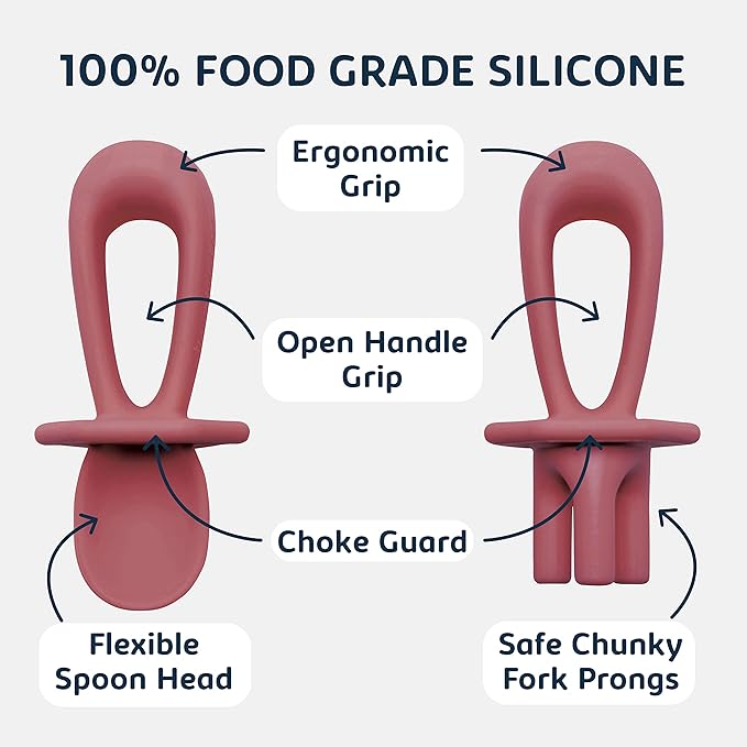 - TRAINING UTENSILS FOR BABY: Train your little one to be an independent self-feeder with a food grade silicone spoon and fork that feels soft and gentle on their gums. Our Tiny Twinkle silicone training utensils or baby-led weaning tools encourage your babies and toddlers in their first stage of self-feeding to learn how to eat in a fun, easy, and safe way.