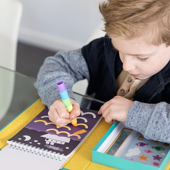- Contains a special 6 color, stackable (twist off) gel crayon with a cap, 36 page prineted activity book and 5 sheets of ocean themed stickers