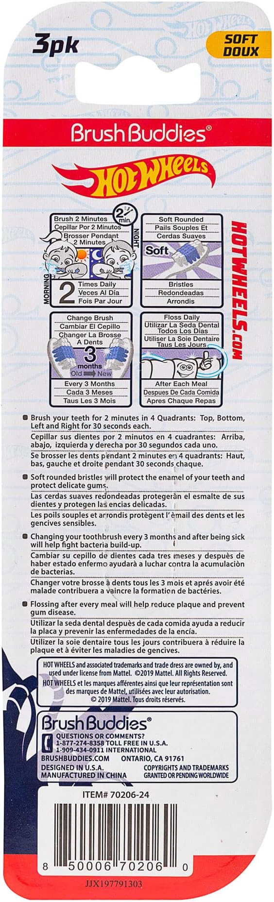 - [What's Included] The Brush Buddies Hot Wheels Manual Toothbrush Pack includes 3 multi-colored Hot Wheels kid's toothbrushes.