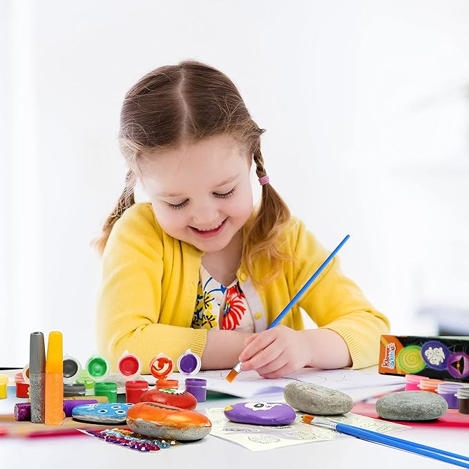 - UNIQUE DESIGN & EASY TO USE. Our arts painting kit comes with different types of paints, halloween stickers, brushes and other craft materials for the kids to use! The rock painting kit is a great alternative because they will encourage your kids to love nature. It gives them a sense of creation.