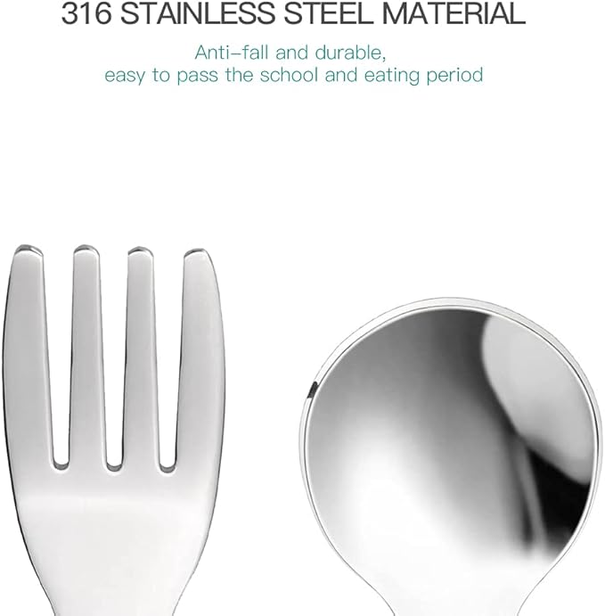 - SAFETY AND PRACTICALITY – Rounded and smooth for the baby’s delicate gum and teeth, no sharp edges on the utensils, baby taste more comfortable. The widened tines and round tips on the fork can easily fork fruit and noodles, Baffled Design on the spoon can prevent the spoon from getting too deep in baby’s mouth and better containing the food.