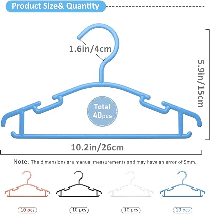 - Multi-color: Plastic kids hangers come in 4 colors, blue, white, pink, black, 10 per each color. These clothes Hanger are thickened, but it is very lightweight and not easy to break.
