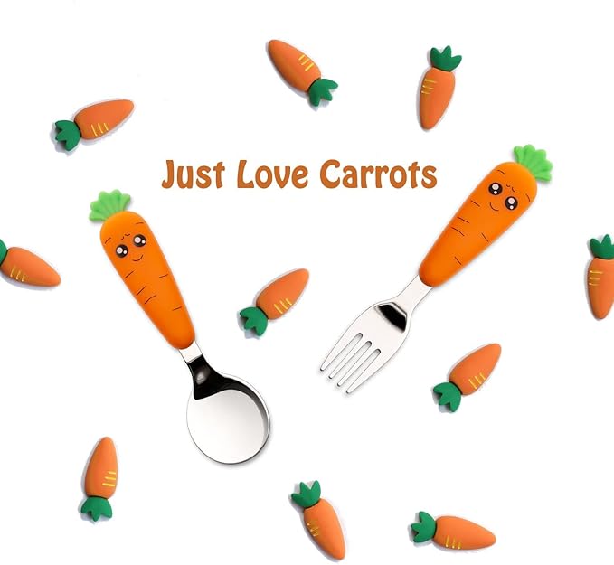 • TODDLERS THROUGH KIDS TO USE – The flat carrot spoon and fork handles have a good size for a child to grip, and allows the toddler to pick up food properly. It fits for the toddler & kids from 18 to 72 months. We believe our cute fork and spoon set will be one of the baby flatware sets that your family will have for years.