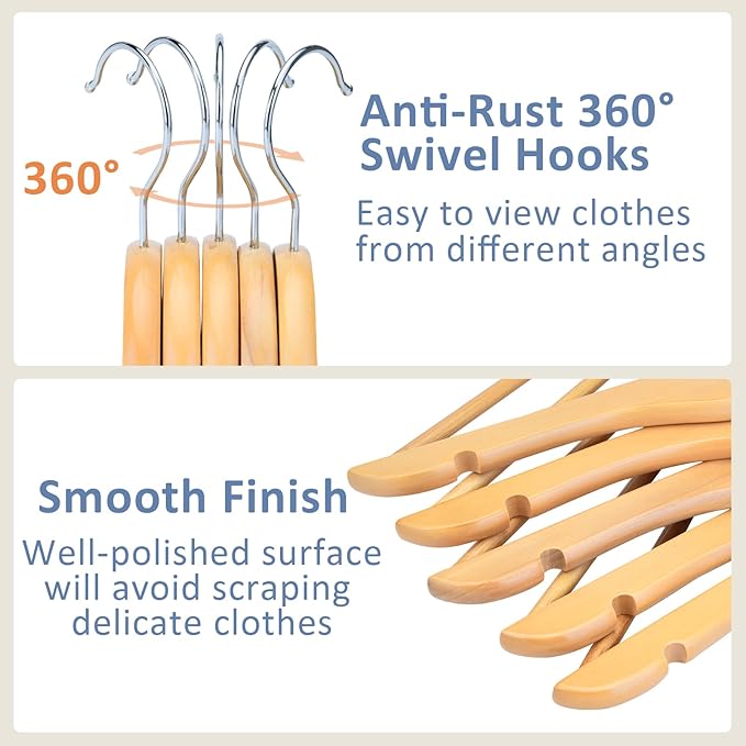 FairyHaus Kids Hangers 20 Pack 12.8 Inch, Natural Wooden Baby Hangers for Closet, Anti-Rust 360° Swivel Hook, Notches & Smooth Finish, Durable and Strong Childrens Hangers for Clothes