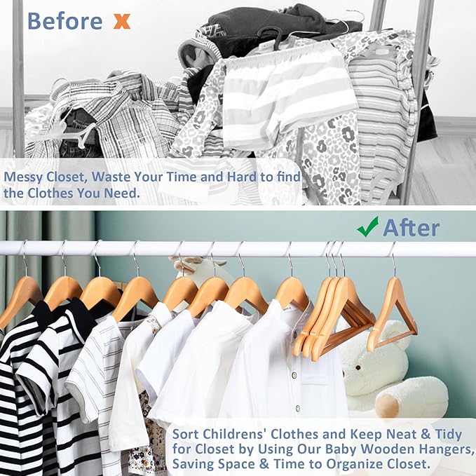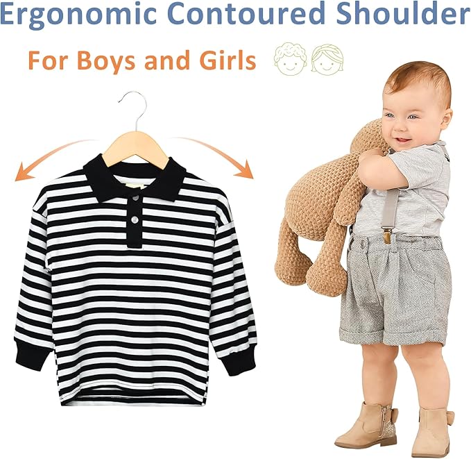 - Child-friendly Design & Smooth Surface: Well-polishing childrens hangers with smooth finish will protect little hands. No rough edge and burr on the baby clothes hangers' surface to avoid scraping delicate clothes.