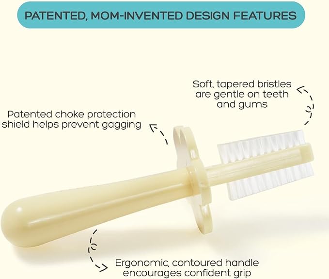 - SOFT BRISTLES & CHOKE PROTECTION: Our patented baby toothbrush ensures a mess-free cleaning experience. With a choke barrier, it prevents over-insertion and gagging. Soft bristles are gentle on tender gums and new baby teeth. A must-have for your 1-year-old's dental care kit, perfect for toddlers transitioning from finger toothbrushes.
