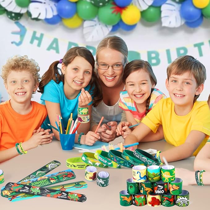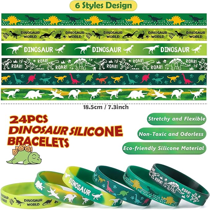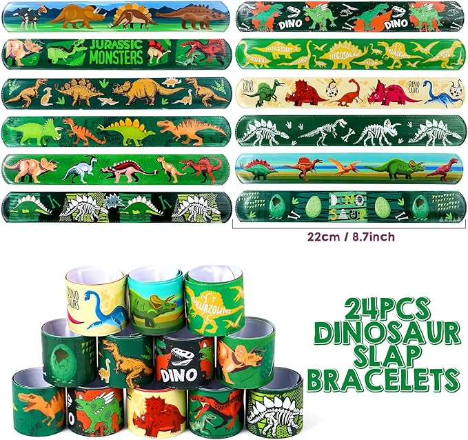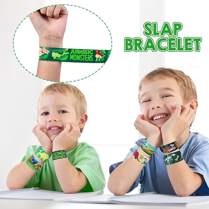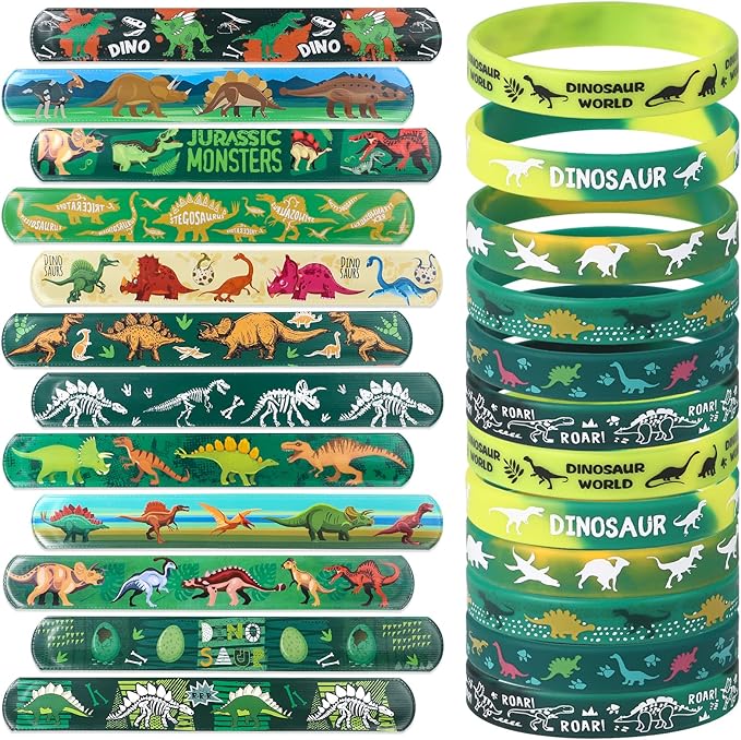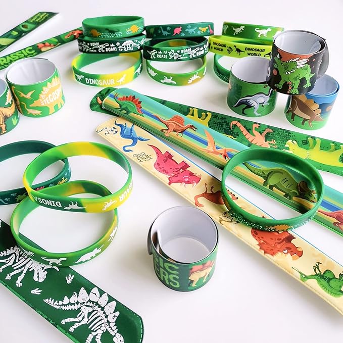 - Package includes: There are 48 dinosaur-themed wristbands. 24 dinosaur slap bracelets and 24 dinosaur silicone bracelets, each with 12 different dinosaur patterns, sufficient quantity and style can meet your party decoration and daily wear. Bring your kids endless fun, and share it with your family and friends