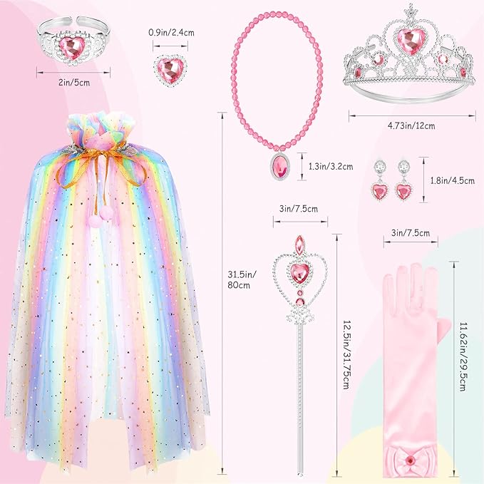 • Princess Dress Up Set: Come with princess cape, princess crown tiara, princess magic wand, princess gloves, bracelet, ring, necklace, clip-on earrings. Rich dress up accessories for your little girls.