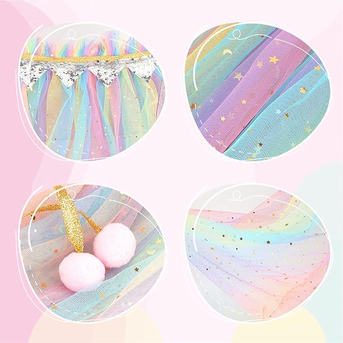 • Stylish and Sequins Cloak: Princess cape is made of soft and high quality mesh fabric, the neck of cloak with soft gold strap to prevent the shawl from falling off. Long and lightweight princess cape dotted with stars and moons that little girls love, very dazzling, makes your little girls stand out of crowd.