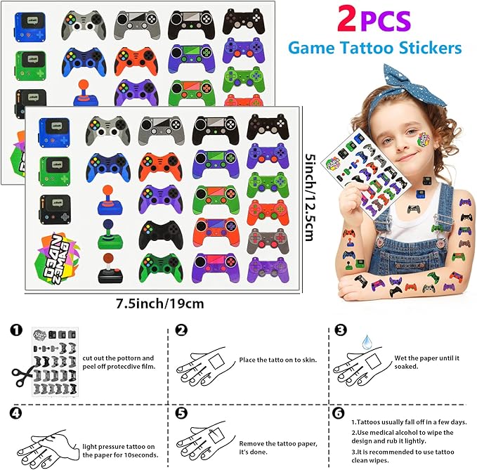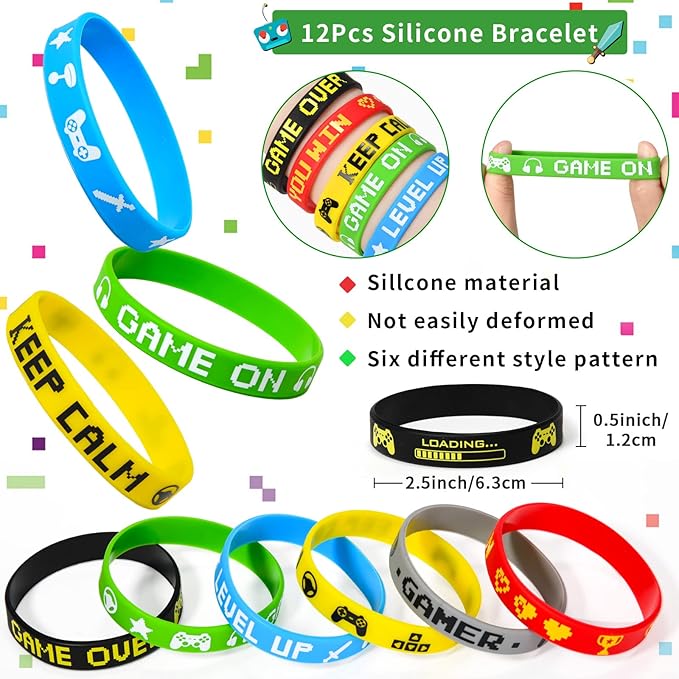 - Video Game Party Favors Supplies: We offer 12 invisible ink pens (green, red, black), 12 mini notebooks, 12 game themed paper bags (3 types), 12 silicone wristbands (6 types), 12 stampers (10 types), 12 keychains (6 types), 2 sheet tattoo stickers (48pcs patterns). This is a very interesting and rich set of game party favors, how can gamers not fall in love with it