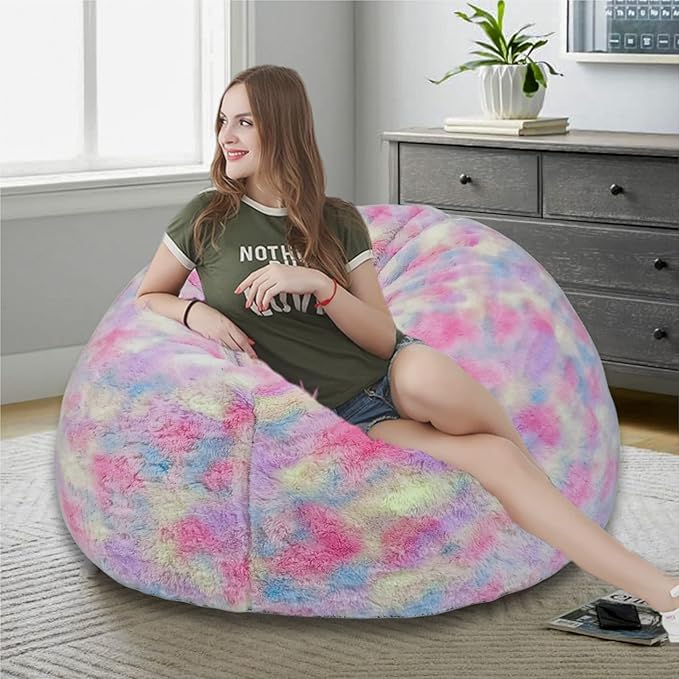 , New Tie Dye Rainbow Design Furry Bean Bag Chair. Premium And Luxurious Fur Bean Bag Without Bean Only Cover Jumbo, Multi
