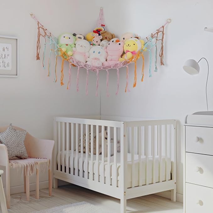 - Net For Stuffed Animals In The Corner: The corner plush toys net holder can make the most of the corner position, keep house tidy, and free up valuable space for your children to play. It is an alternative to bean bags, storage boxes, baskets and litter boxes.