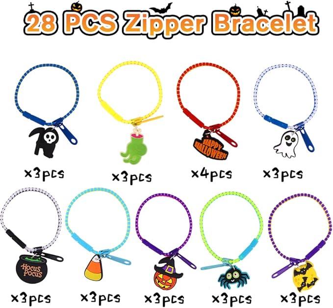 - HALLOWEEN THEMED ZIPPER BRACELET-The package contains 28 Halloween-themed zipper bracelets in 9 different styles. There are enough quantities and styles to meet your and your kid's different Halloween needs.
