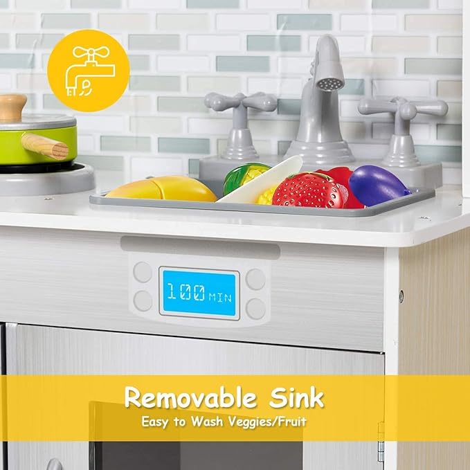 - High Quality Wooden Kitchen: This children's kitchen is made of high-quality wood material. Children can enjoy the modern version and learn how to use kitchen utensils in the role playing games.