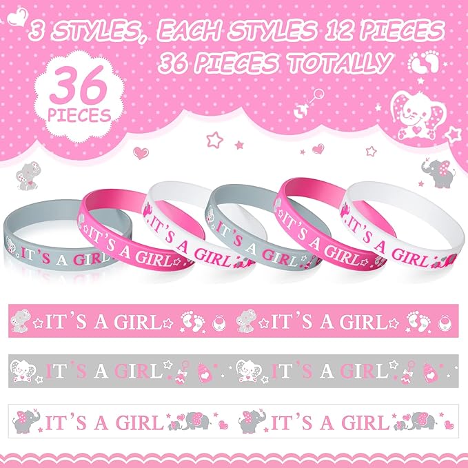 Zomiboo 36 Pieces Baby Shower Rubber Bracelets, It's a Girl Wristbands Elephant Baby Shower Decorations for Boy Girl Baby Shower Party Favor Gender Reveal Party Supplies(Girl Style)