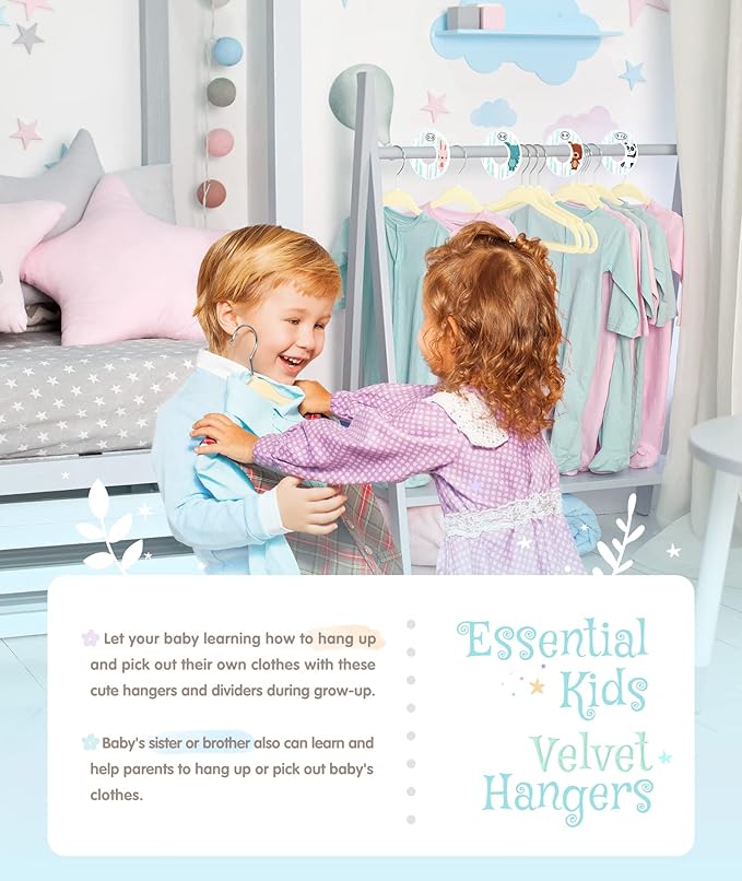 - Space Saver: Little 11 inch velvet kids hangers with nice and slim design, provides more storage space to hold more clothes; makes putting baby clothes up easy and organized, keep nursery closet or wardrobe looking clean and neat