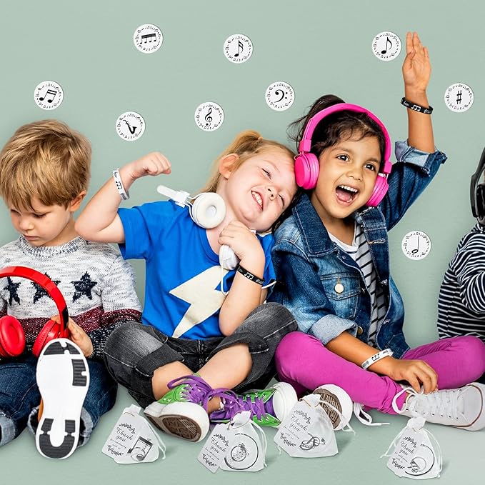 - Size Information: the musical note keychain is about 2 inch, the diameter of the bracelet is 2.5 inch and 0.5 inch wide, each sticker is about 1.5 inch in diameter, the tags measure approx. 3.54 x 1.97 inch, the bags are approx. 3.94 x 4.72 inch, fits most kids and adults to use, and suitable for carrying and storing