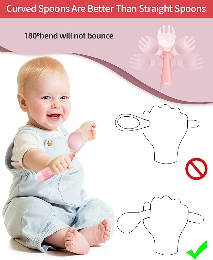 • [Ergonomic Design] The tableware is specifically made to help babies with their grip training. It can bend in any direction without rebounding, enabling the infant to eat at different angles and encouraging the development of agility and hand-eye coordination.