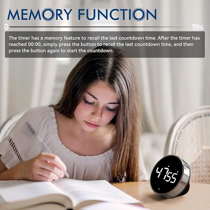 - MEMORY FUNCTION: This kitchen timer can memorize the last use set. After the timer has reached 00:00, simply press the button to recall the previous countdown time, and then press the button again to start the countdown