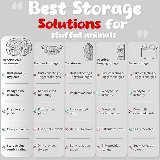 - Wekapo Puts Customers First - Wekapo Stuffed Animal Storage Bean Bag Chairs offer a 90-day unconditional return or exchange policy. Wekapo is dedicated to address any product/service issues and is committed to delivering a 5 star experience for all buyers.