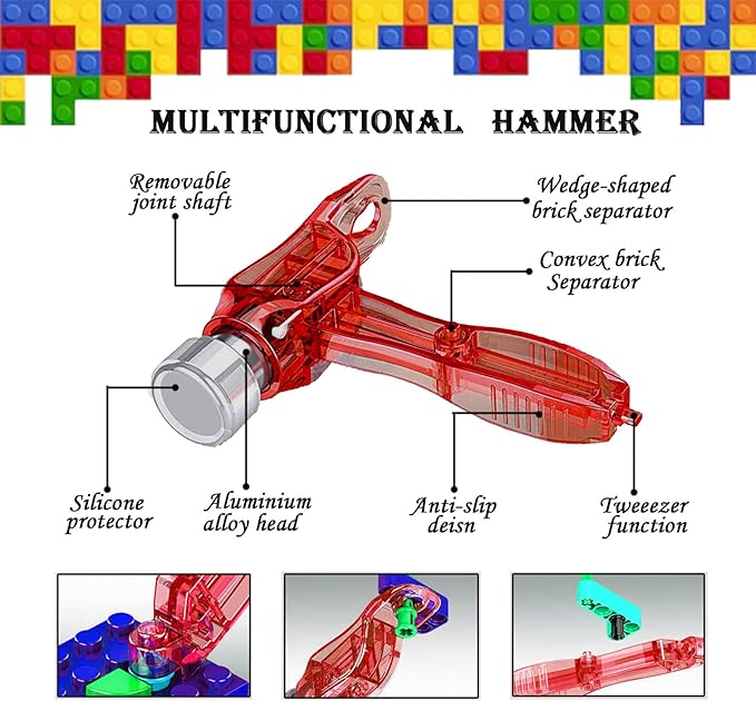- MULTIFUNCTIONAL HAMMER AND BRICK PLIERS: Both the hammer and pliers have silicone protectors by the head, protecting the bricks or blocks from any possible damage. The hammer is made of two parts (connect or disconnect with the cross bolt) with different functions to help install or remove the blocks. The Pliers can separate bricks with different sizes or shapes quickly