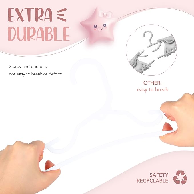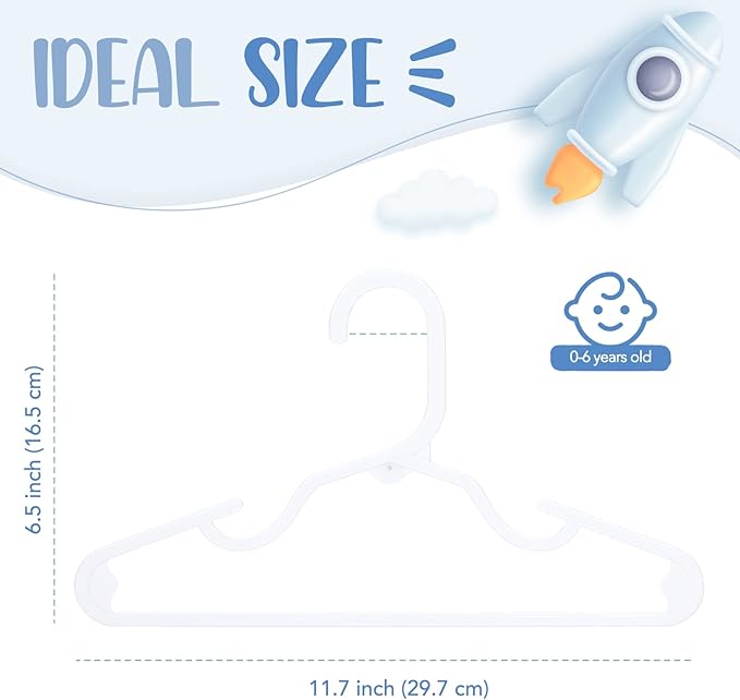 - Baby Hangers For Nursery: The small hangers are suitable for kids aged 0-7 years old, from baby clothes to toddler and child-sized garments. Plastic kids hangers are easy to clean and are less likely to collect dust or dirt than other types of kid hangers, making them an ideal choice for baby girl hangers.