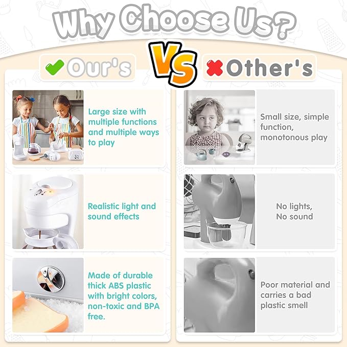 • High-fidelity play kitchen accessories for kids:cocinas de niñas including a pretend toy coffee maker for kids, a toy mixer, and a toy toaster, which can be used to accompany children to spend a happy parent-child time, guide children to make afternoon tea by themselves, and your children can make Coffee and make delicious cookies with you. improve children's hands-on ability, and cultivate children's interest.
