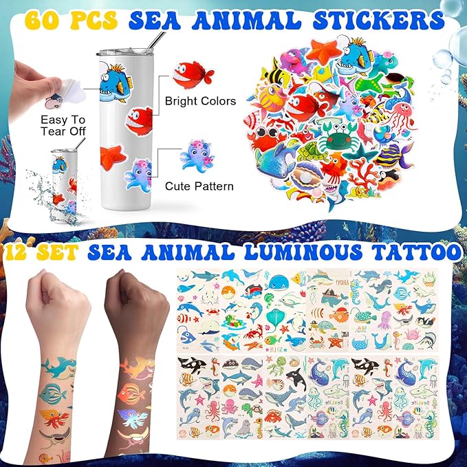 - 144 PCS Ocean Party Favors: you will get total 144 pcs under the sea party favors, including 12 bracelets, 60 stickers, 12 luminous tattoos, 12 rings, 12 stampers, 12 keychains, 12 gift bags, 12 water growing sea creatures (needs to be soaked in water for 72 h to grow bigger), sufficient quantity and various styles enrich your ocean party