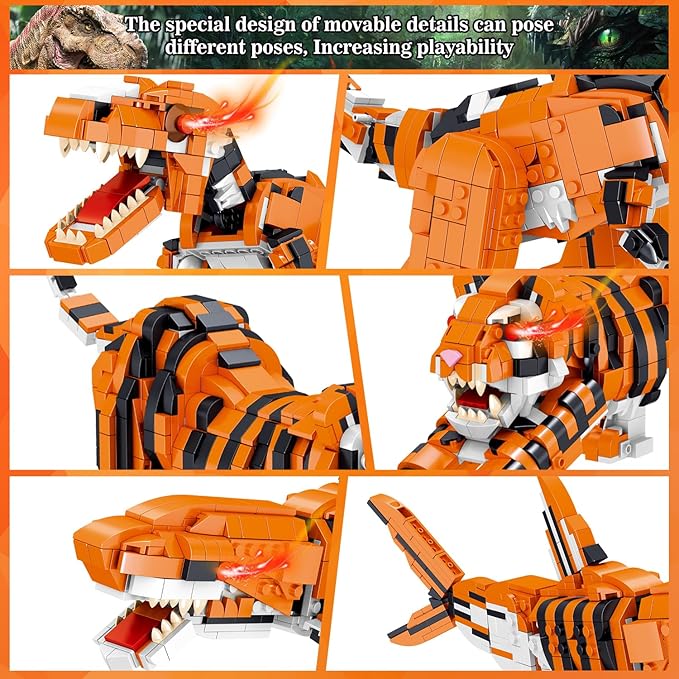 - 【Realistic Shape Design】Tyrannosaurus rex toy can move its head, Body, Shoulders, Jaw, Legs and tail. Tiger toy can move its jaw, Legs, Feet and tail. Shark toy's head, Body and tail can Swing left and right, the fins can swing up and down. More than 10 flexible joints are special design to pose in different poses, Satisfying the love of building block fans for animal model theme, Helps provide hours of pretend play for block fans