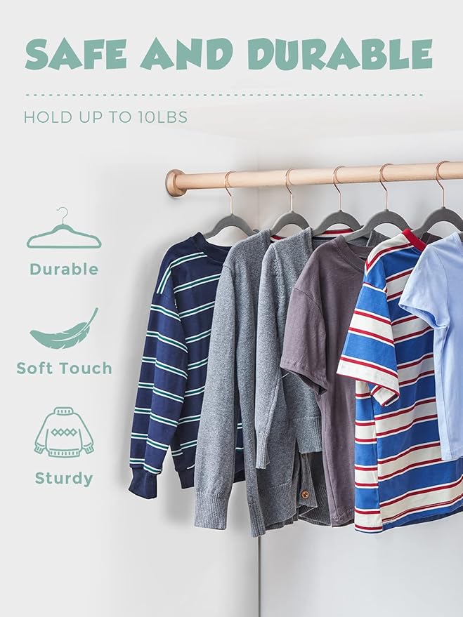 - Non Slip Small Velvet Hangers: Unlike plastic or metal hangers, the velvet child hangers made of luxurious velvet and improved high-grade ABS plastic, can hold up to 10 lbs; These childrens hangers for clothes will hold even the heavy coats or jeans securely in your kid's closet, making your baby room decor more elegant and tidy