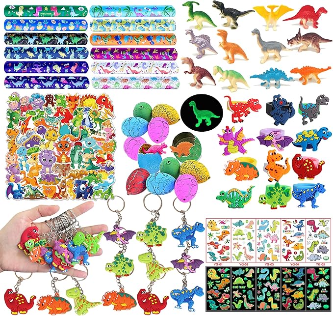 - PACKAGE - 12pcs dinosaur luminous tattoo stickers, 60pcs dinosaur stickers, 12pcs dinosaur rings, 12pcs dinosaur keychains, 12pcs luminous dinosaurs, 12pcs dinosaur slap bracelets, 12pcs dinosaur eggs, total 132 pieces dinosaur party supplies, will be great for kids party favors.