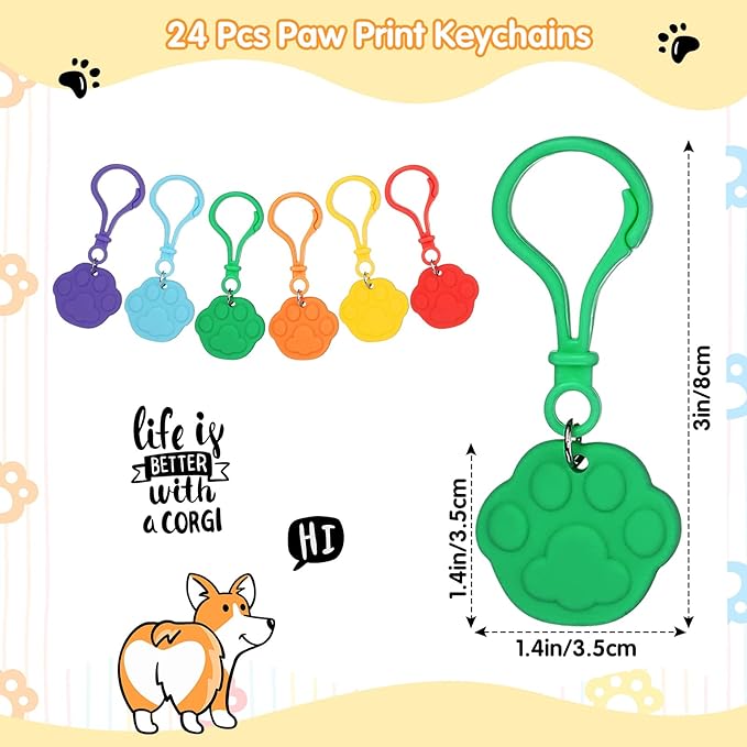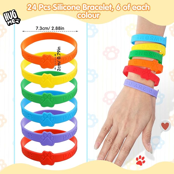- Dog Paw Party Favors: you will receive 24 pieces of rubber bracelet in 6 colors, 24 paw print stamp, 24 paw print acrylic lobster keychain, a nice combination to meet your different needs